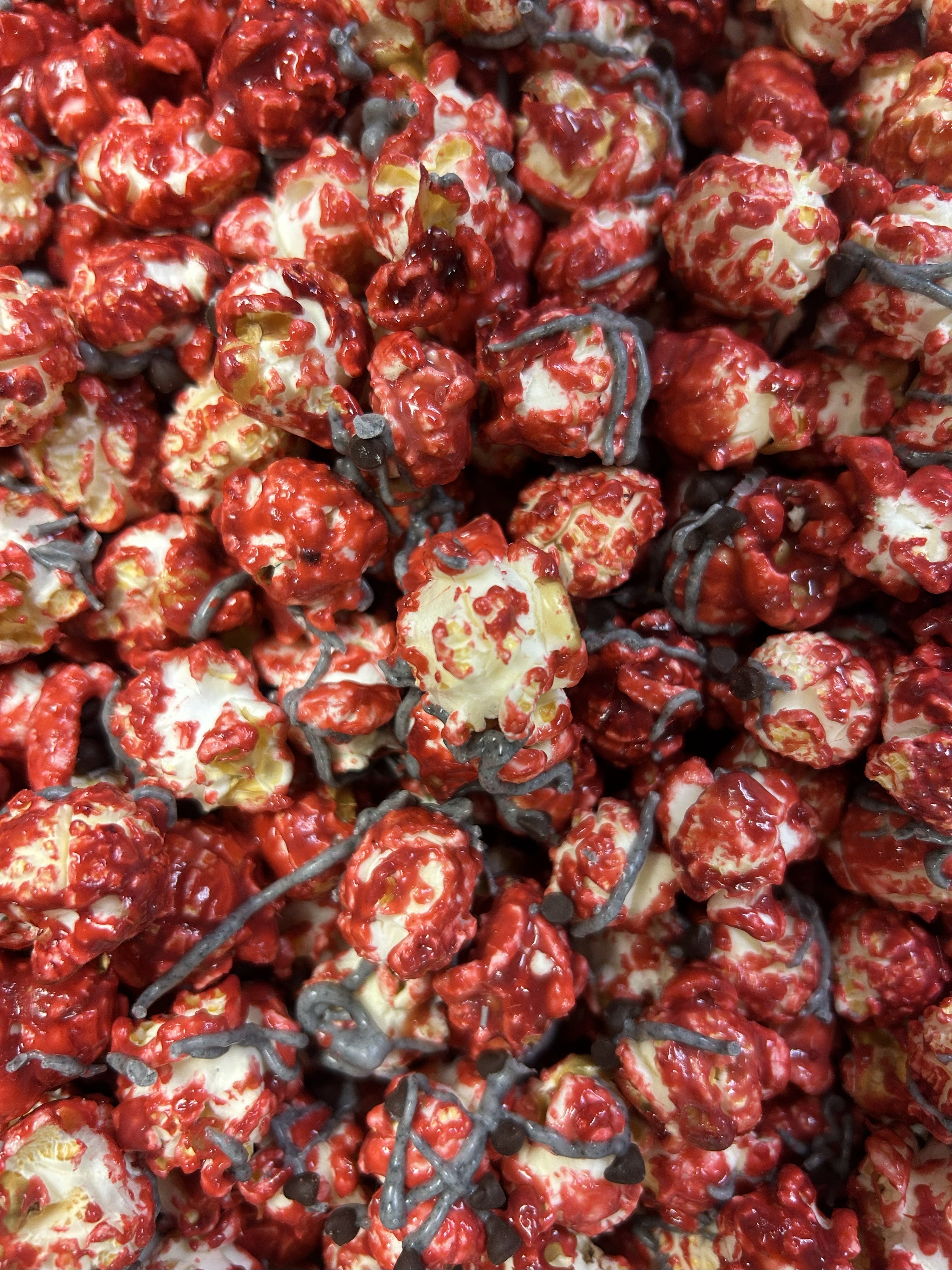 Sink your fangs into Midnight Bite — a wickedly delicious red cherry popcorn, drenched in a ghostly midnight white chocolate drizzle and finished with a sprinkle of tiny dark chocolate chips. It’s the perfect mix of spooky and sweet, made to haunt your taste buds in the best way. One bite and you’re under its spell…Get a bag before it vanishes into the night!